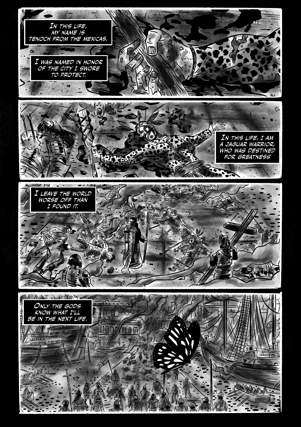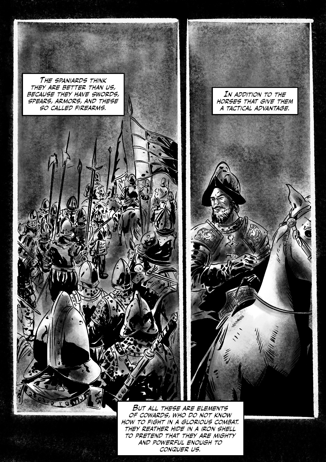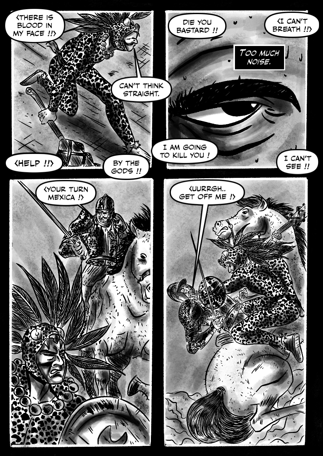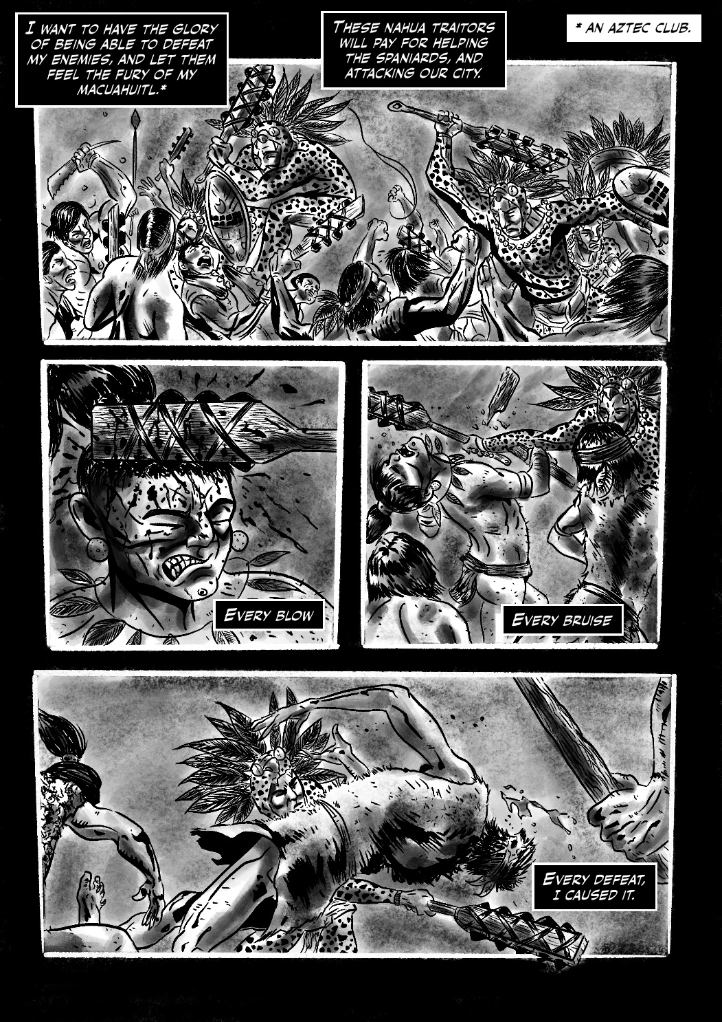 The comic explores the end of the Aztec civilization (Mexica as they were known at the time) and their glorious city, Tenochtitlán, by Spanish explorers. Who brought not only firearms to fight the natives, but also diseases from the old continent.