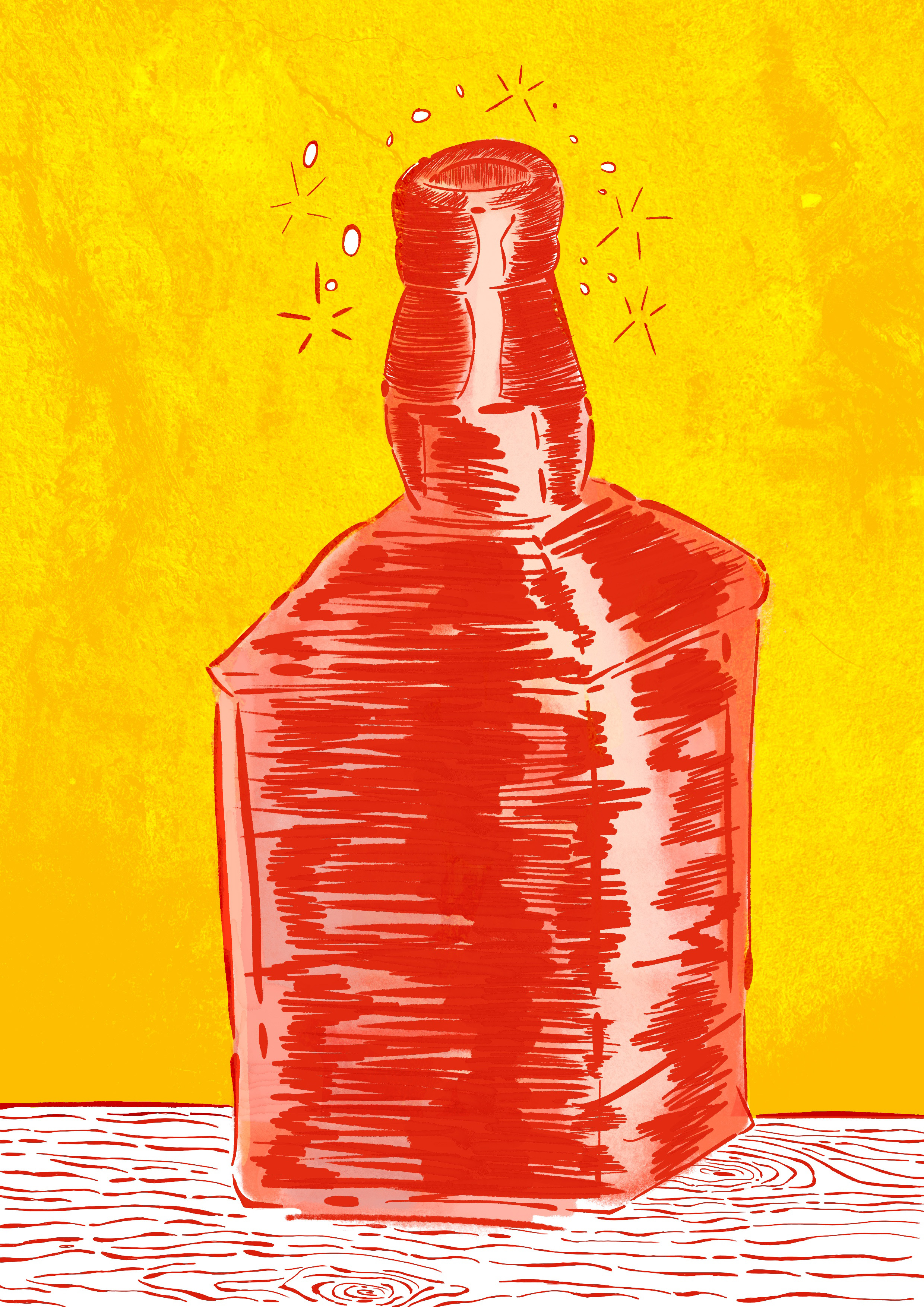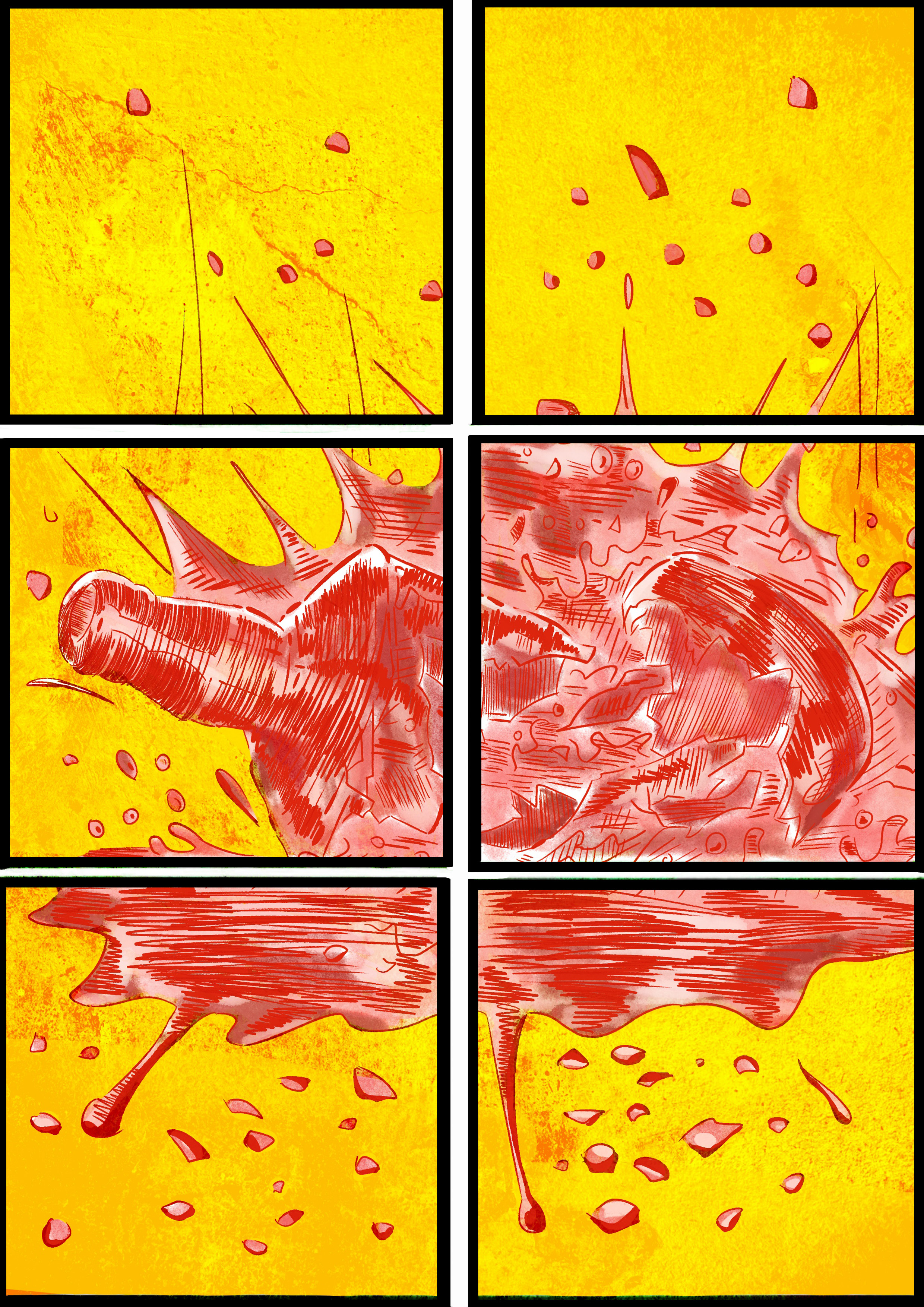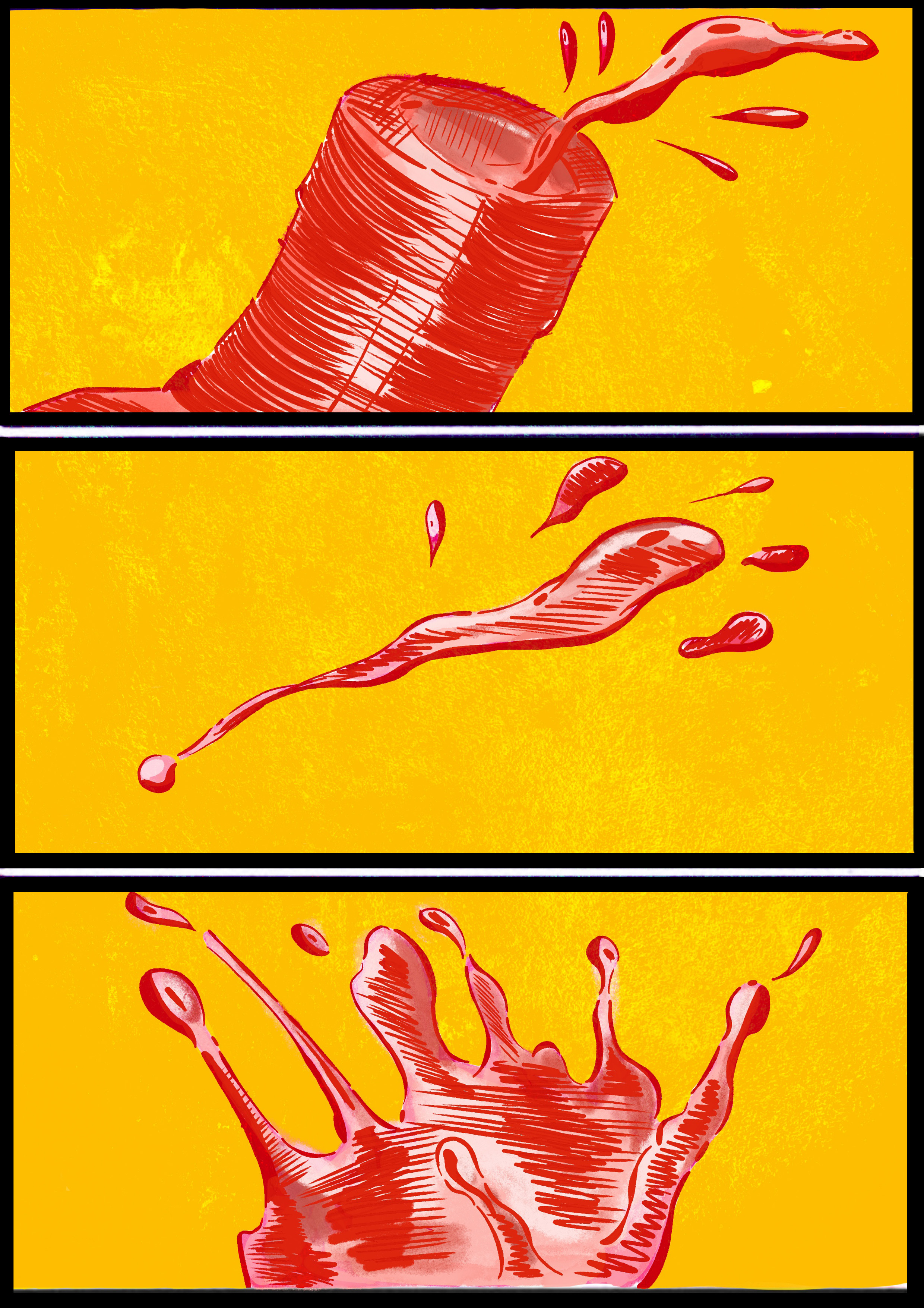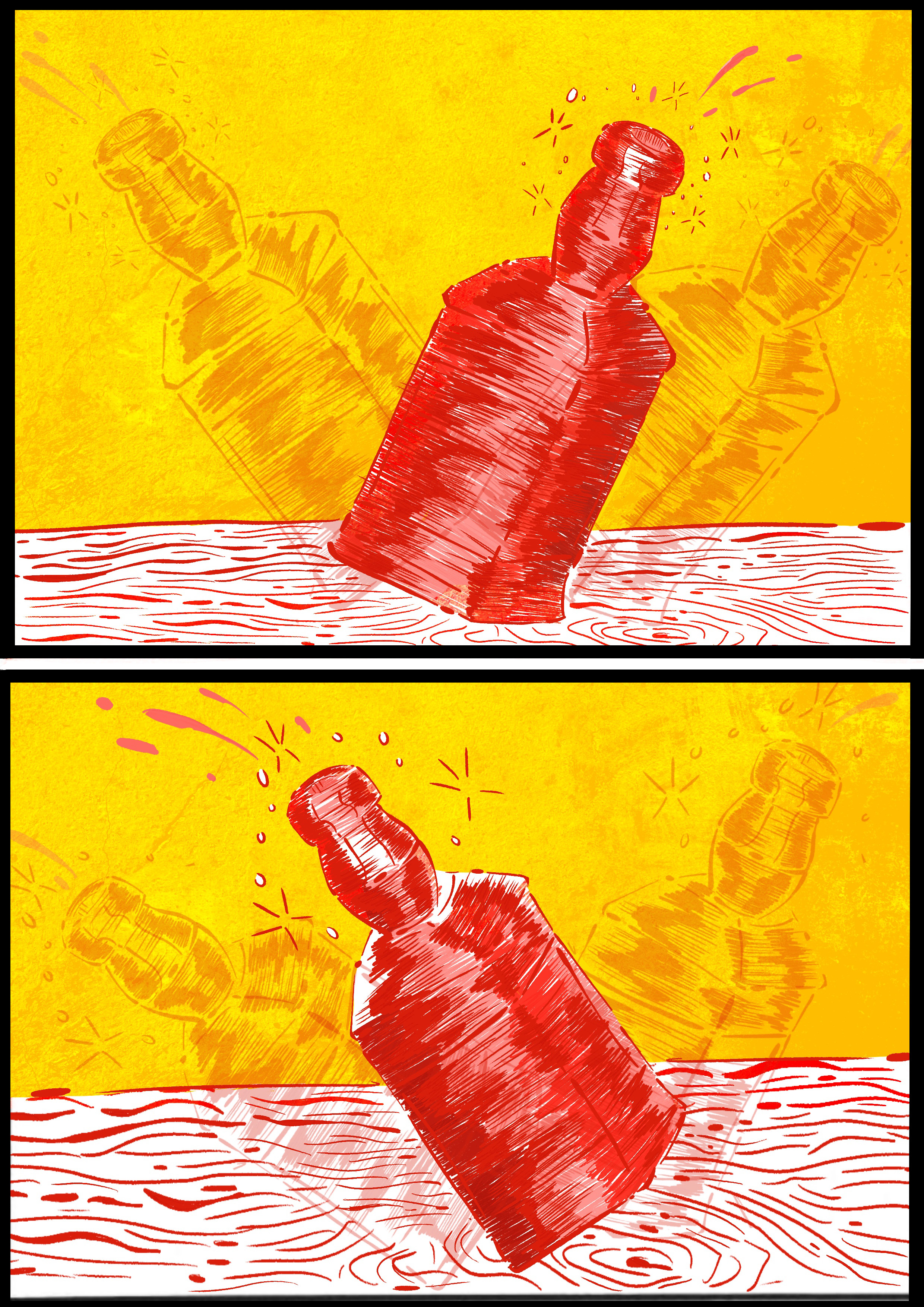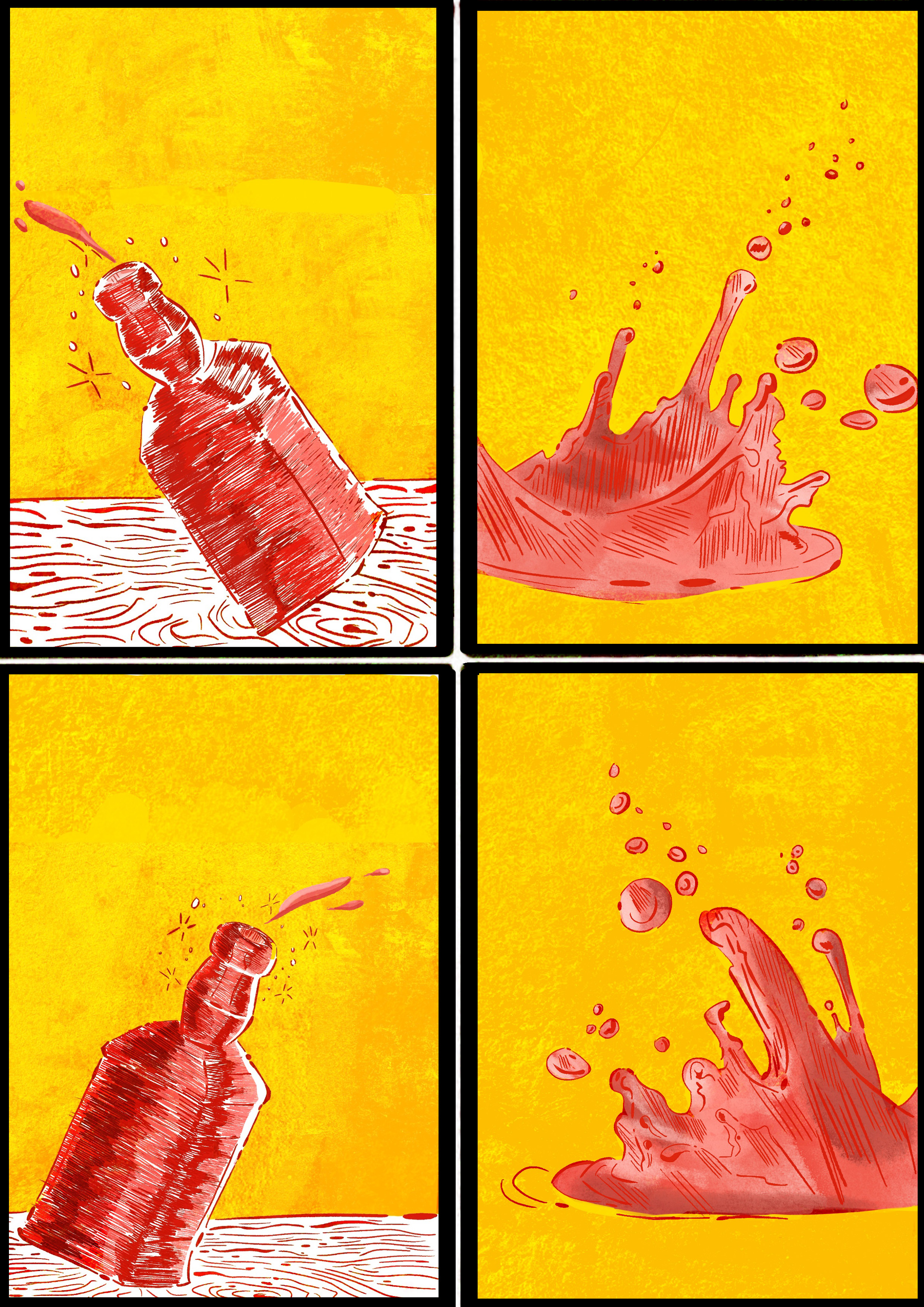 This is a series of illustrations where the idea was to make an inanimate object move somehow. And with the limitation of using just two colours ( In this case red and yellow). The idea was to make a drunk bottle, where it moves around splashnig its liquid without control. And in the end it falls off the table where it was and then crashes on the floor, spilling its liquid as if it were a river going directly to the drain. This was a work done mainly to understand the issue of repetition and movment, using different angles.